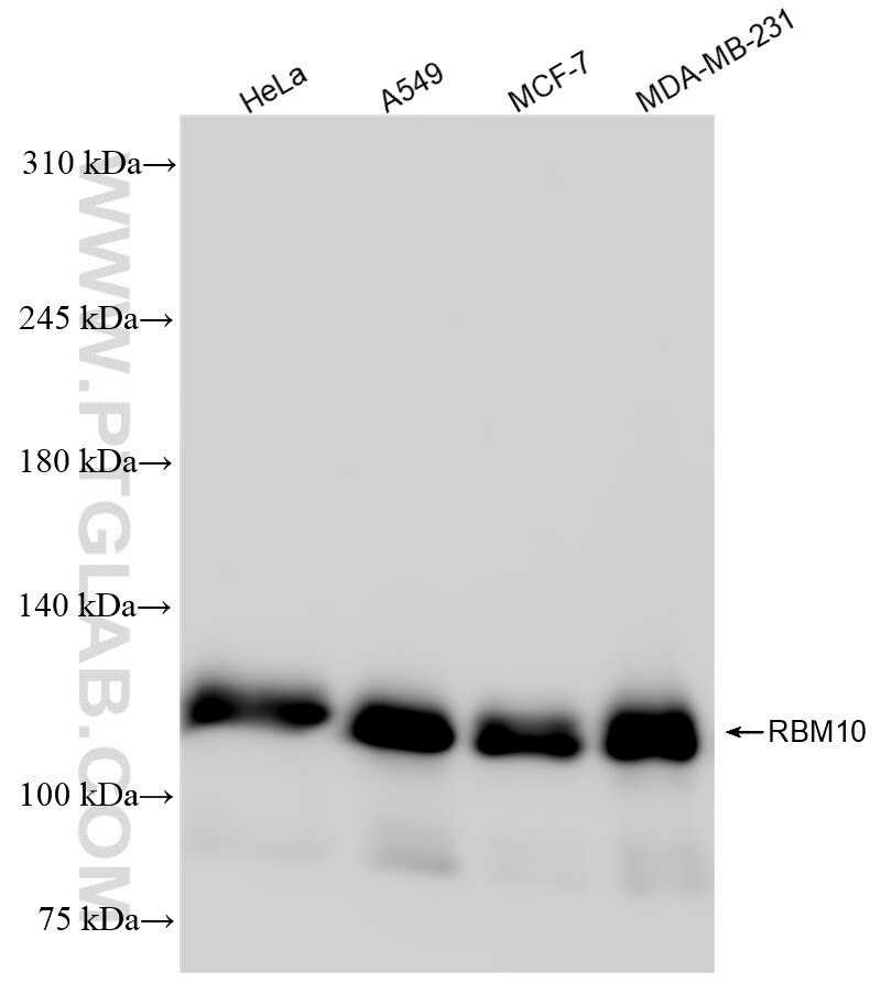 The RBM10 antibody from Proteintech is a rabbit recombinant antibody to a recombinant protein of human RBM10. This antibody recognizes human, rat antigen. The RBM10 antibody has been validated for the following applications: WB, IHC, IF/ICC, FC (Intra), ELISA analysis.