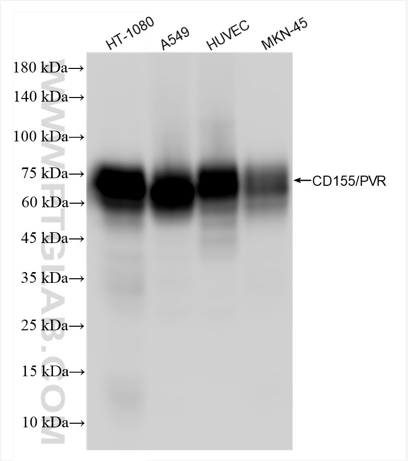 The CD155/PVR antibody from Proteintech is a rabbit recombinant antibody to a recombinant protein of human CD155/PVR. This antibody recognizes human antigen. The CD155/PVR antibody has been validated for the following applications: WB, IHC, ELISA analysis.