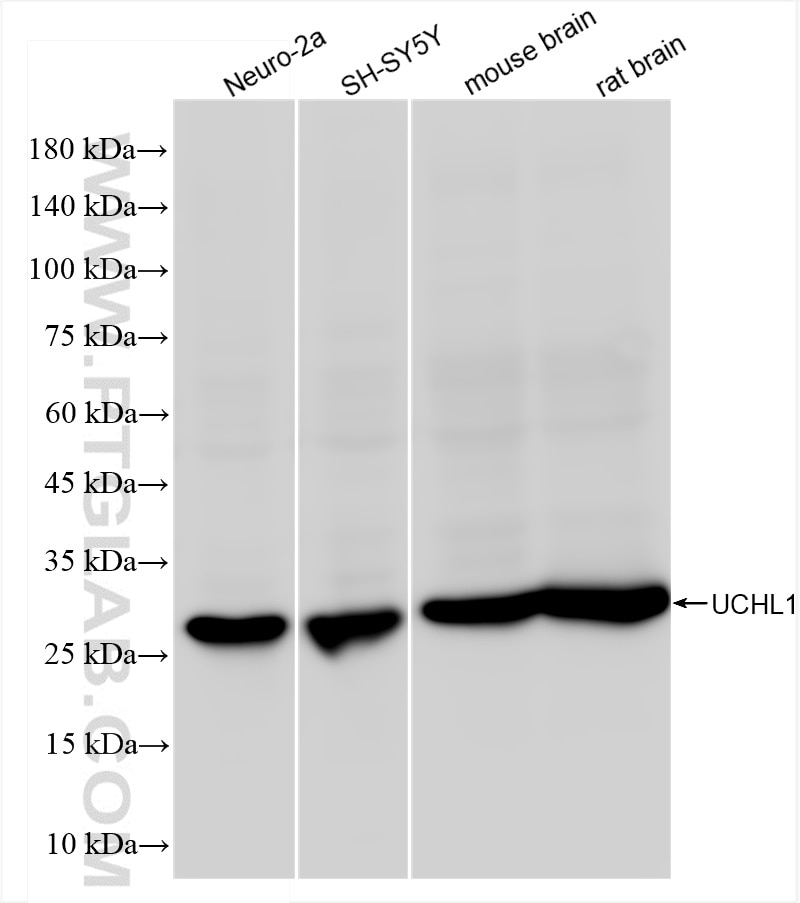 The UCH-L1/PGP9.5 antibody from Proteintech is a rabbit recombinant antibody to a recombinant protein of human UCH-L1/PGP9.5. This antibody recognizes human, mouse, rat antigen. The UCH-L1/PGP9.5 antibody has been validated for the following applications: WB, IHC, IF-P, ELISA analysis.