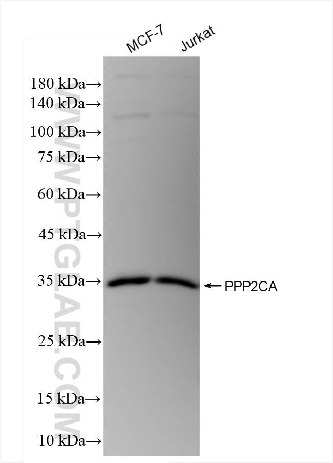 The PPP2CA antibody from Proteintech is a rabbit recombinant antibody to a fusion protein of human PPP2CA. This antibody recognizes human antigen. The PPP2CA antibody has been validated for the following applications: WB, ELISA analysis.