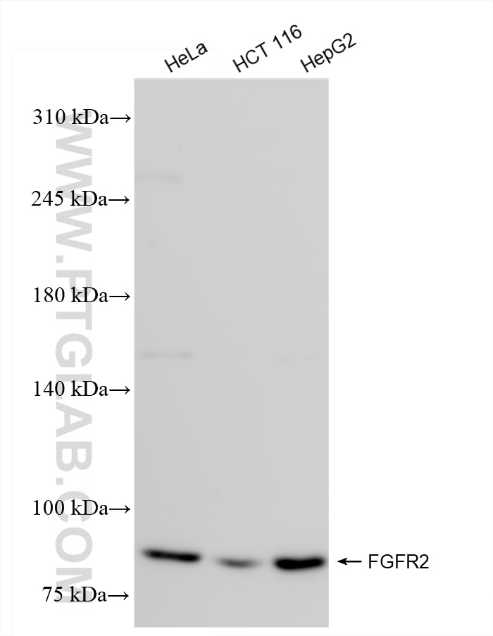 The FGFR2 antibody from Proteintech is a rabbit recombinant antibody to a recombinant protein of human FGFR2. This antibody recognizes human, mouse antigen. The FGFR2 antibody has been validated for the following applications: WB, IHC, ELISA analysis.