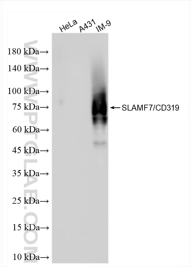 The SLAMF7/CD319 antibody from Proteintech is a rabbit recombinant antibody to a recombinant protein of human SLAMF7/CD319. This antibody recognizes human antigen. The SLAMF7/CD319 antibody has been validated for the following applications: WB, IHC, ELISA analysis.