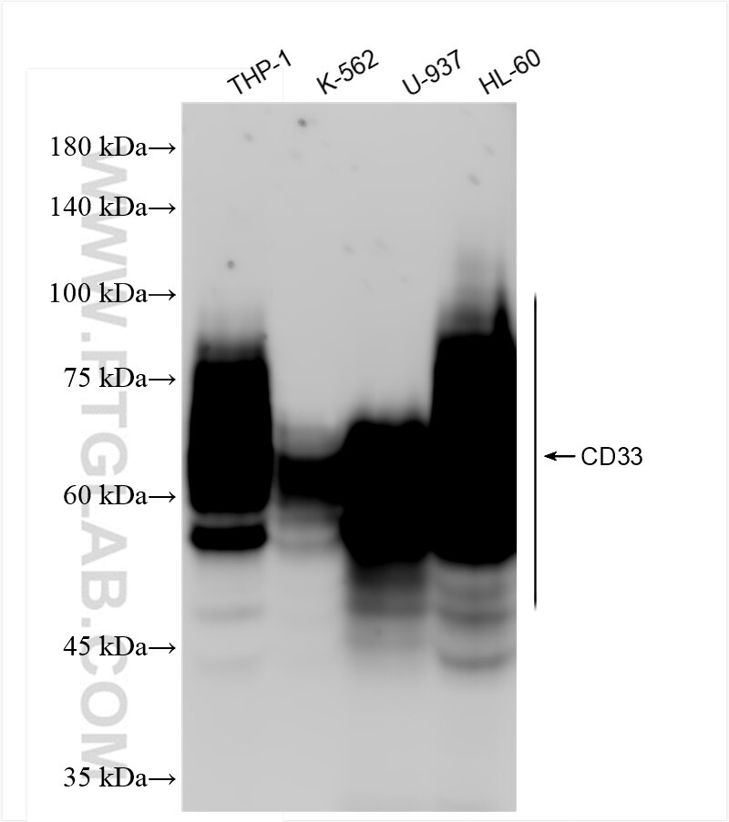 The CD33 antibody from Proteintech is a rabbit recombinant antibody to a fusionprotein of human CD33. This antibody recognizes human antigen. The CD33 antibody has been validated for the following applications: WB, IHC, ELISA analysis.