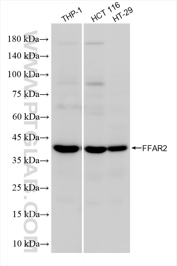 The FFAR2 antibody from Proteintech is a rabbit recombinant antibody to a peptide of human FFAR2. This antibody recognizes human, mouse antigen. The FFAR2 antibody has been validated for the following applications: WB, IF-P, ELISA analysis.