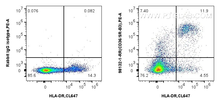 The CD36 antibody from Proteintech is a rabbit recombinant antibody to a fusion protein of human CD36. This antibody recognizes human antigen. The CD36 antibody has been validated for the following applications: FC analysis.