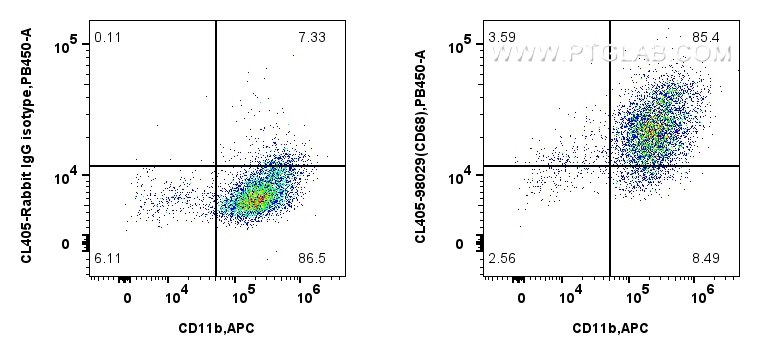 The CD68 antibody from Proteintech is a rabbit recombinant antibody to a fusion protein of mouse CD68. This antibody recognizes mouse antigen. The CD68 antibody has been validated for the following applications: FC (Intra) analysis. This antibody is coraliteR plus 405.