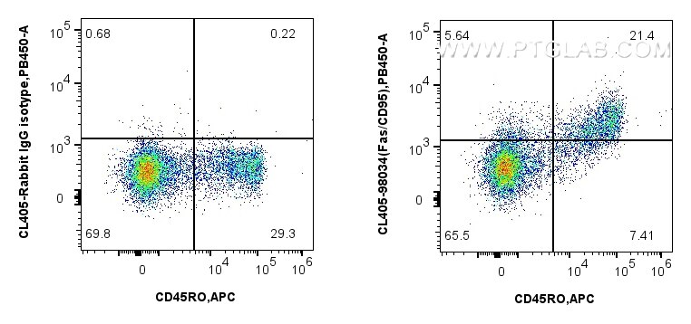 The Fas/CD95 antibody from Proteintech is a rabbit recombinant antibody to a fusion protein of human Fas/CD95. This antibody recognizes human antigen. The Fas/CD95 antibody has been validated for the following applications: FC analysis. This antibody is coraliteR plus 405.