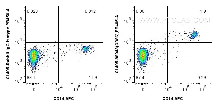 The CD86 antibody from Proteintech is a rabbit recombinant antibody to a fusion protein of human CD86. This antibody recognizes human antigen. The CD86 antibody has been validated for the following applications: FC analysis. This antibody is coraliteR plus 405.