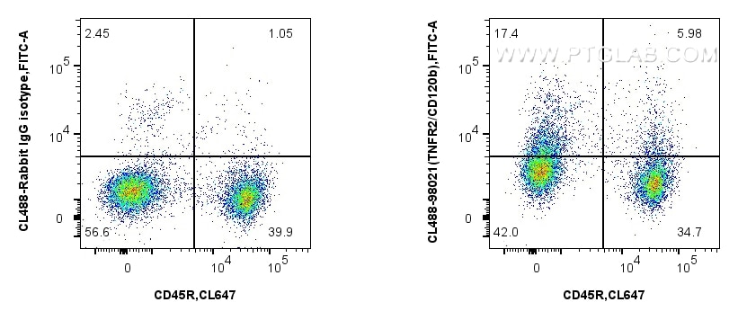 The TNFR2/CD120b antibody from Proteintech is a rabbit recombinant antibody to a fusion protein of mouse TNFR2/CD120b. This antibody recognizes mouse antigen. The TNFR2/CD120b antibody has been validated for the following applications: FC analysis. This antibody is coraliteR plus 488.