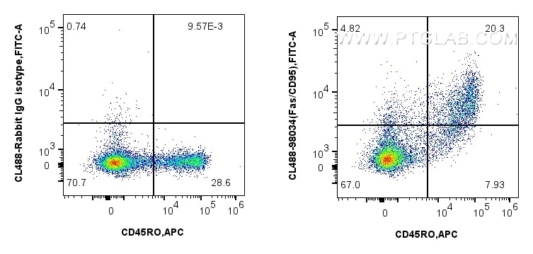 The Fas/CD95 antibody from Proteintech is a rabbit recombinant antibody to a fusion protein of human Fas/CD95. This antibody recognizes human antigen. The Fas/CD95 antibody has been validated for the following applications: FC analysis. This antibody is coraliteR plus 488.