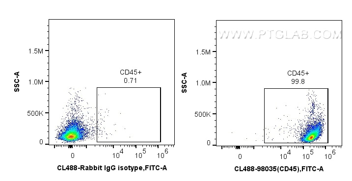 The CD45 antibody from Proteintech is a rabbit recombinant antibody to a recombinant protein of mouse CD45. This antibody recognizes mouse antigen. The CD45 antibody has been validated for the following applications: FC analysis. This antibody is coraliteR plus 488.