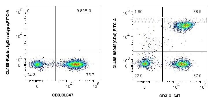 The CD4 antibody from Proteintech is a rabbit recombinant antibody to a recombinant protein of human CD4. This antibody recognizes human antigen. The CD4 antibody has been validated for the following applications: FC analysis. This antibody is coraliteR plus 488.