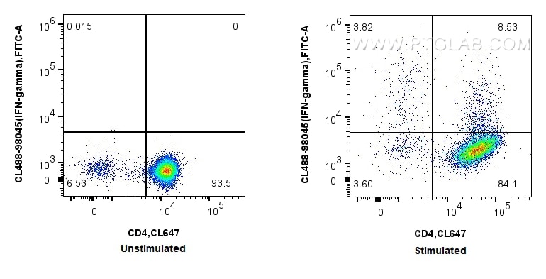 The IFN-gamma antibody from Proteintech is a rabbit recombinant antibody to a fusion protein of mouse IFN-gamma. This antibody recognizes mouse antigen. The IFN-gamma antibody has been validated for the following applications: FC (Intra) analysis. This antibody is coraliteR plus 488.