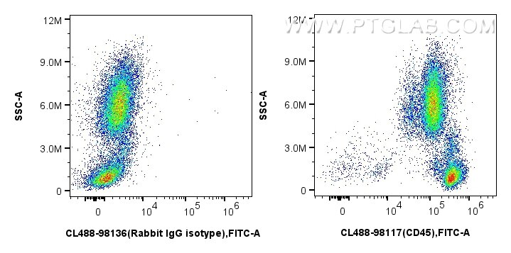 The CD45 antibody from Proteintech is a rabbit recombinant antibody to a recombinant protein of human CD45. This antibody recognizes human antigen. The CD45 antibody has been validated for the following applications: FC analysis. This antibody is coraliteR plus 488.