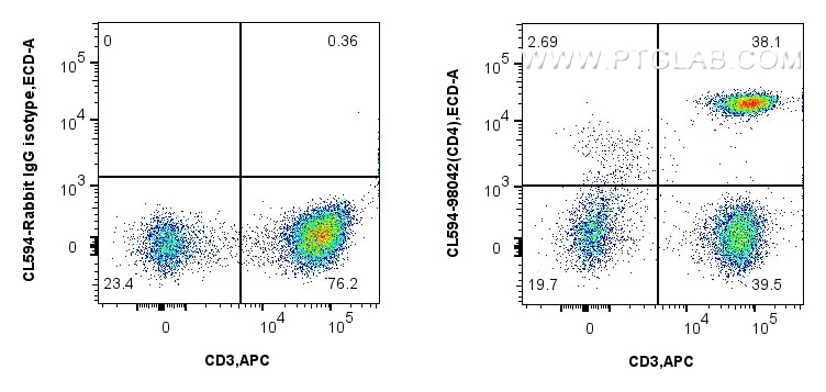 The CD4 antibody from Proteintech is a rabbit recombinant antibody to a recombinant protein of human CD4. This antibody recognizes human antigen. The CD4 antibody has been validated for the following applications: FC analysis. This antibody is coraliteR594.