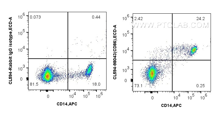 The CD86 antibody from Proteintech is a rabbit recombinant antibody to a fusion protein of human CD86. This antibody recognizes human antigen. The CD86 antibody has been validated for the following applications: FC analysis. This antibody is coraliteR594.
