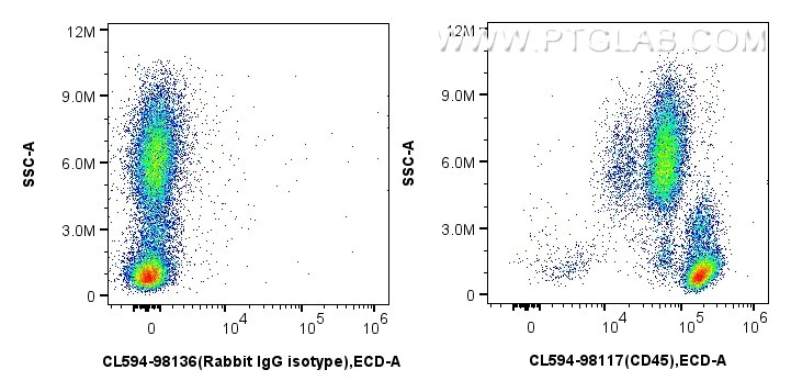 The CD45 antibody from Proteintech is a rabbit recombinant antibody to a recombinant protein of human CD45. This antibody recognizes human antigen. The CD45 antibody has been validated for the following applications: FC analysis. This antibody is coraliteR594.