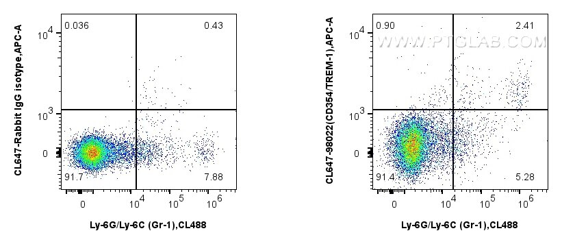 The TREM-1/CD354 antibody from Proteintech is a rabbit recombinant antibody to a fusion protein of mouse TREM-1/CD354. This antibody recognizes mouse antigen. The TREM-1/CD354 antibody has been validated for the following applications: FC analysis. This antibody is coraliteR plus 647.