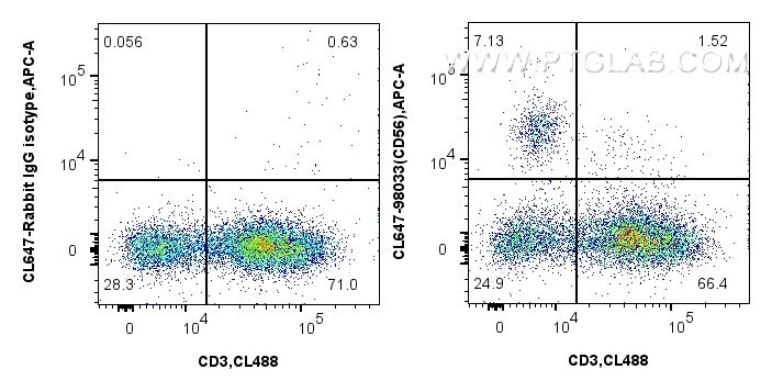The NCAM1/CD56 antibody from Proteintech is a rabbit recombinant antibody to a fusion protein of human NCAM1/CD56. This antibody recognizes human antigen. The NCAM1/CD56 antibody has been validated for the following applications: FC analysis. This antibody is coraliteR plus 647.