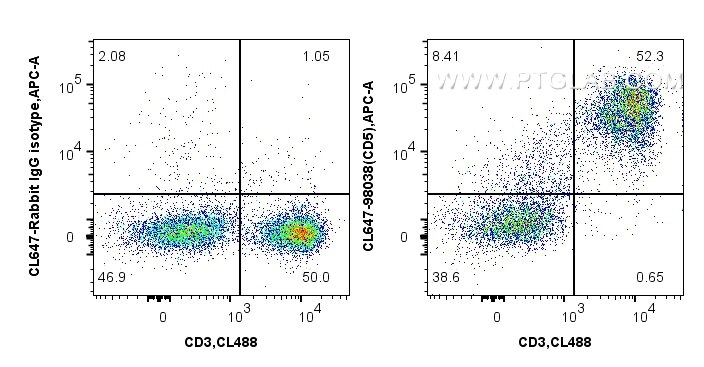 The CD5 antibody from Proteintech is a rabbit recombinant antibody to a fusion protein of mouse CD5. This antibody recognizes mouse antigen. The CD5 antibody has been validated for the following applications: FC analysis. This antibody is coraliteR plus 647.