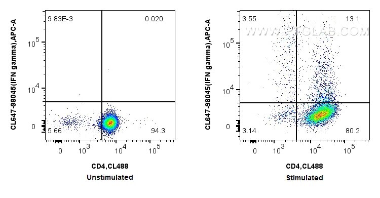 The IFN-gamma antibody from Proteintech is a rabbit recombinant antibody to a fusion protein of mouse IFN-gamma. This antibody recognizes mouse antigen. The IFN-gamma antibody has been validated for the following applications: FC (Intra) analysis. This antibody is coraliteR plus 647.