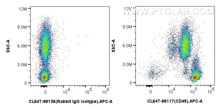 The CD45 antibody from Proteintech is a rabbit recombinant antibody to a recombinant protein of human CD45. This antibody recognizes human antigen. The CD45 antibody has been validated for the following applications: FC analysis. This antibody is coraliteR plus 647.
