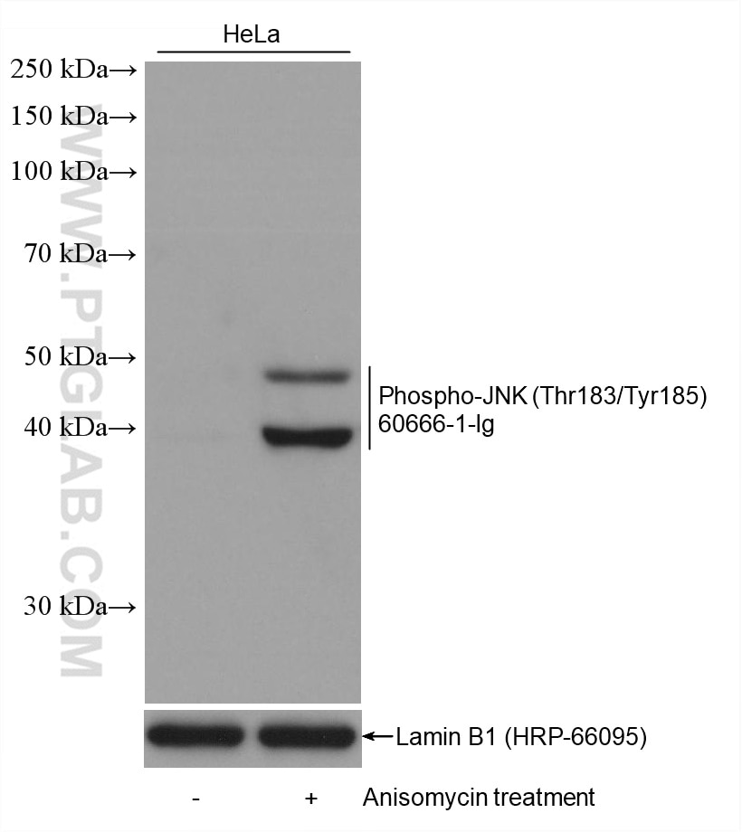 The Phospho-JNK (Thr183/Tyr185) antibody from Proteintech is a mouse monoclonal antibody to a peptide of human Phospho-JNK (Thr183/Tyr185). This antibody recognizes human, mouse, rat antigen. The Phospho-JNK (Thr183/Tyr185) antibody has been validated for the following applications: WB, IHC, ELISA analysis.
