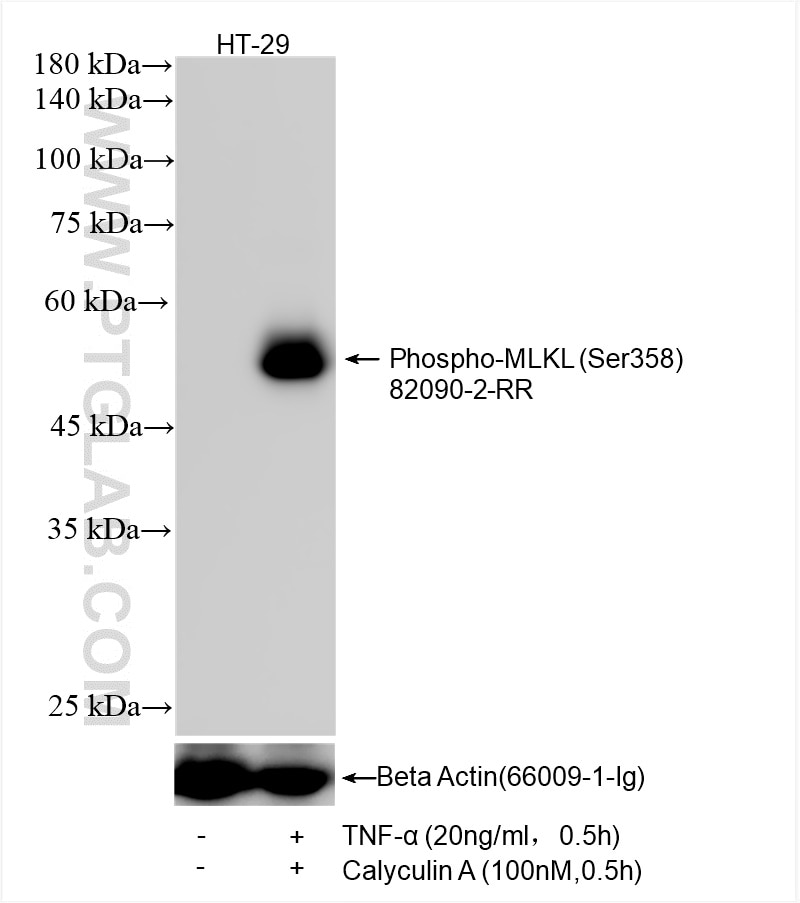 The Phospho-MLKL (Ser358) antibody from Proteintech is a rabbit recombinant antibody to a peptide of human Phospho-MLKL (Ser358). This antibody recognizes human antigen. The Phospho-MLKL (Ser358) antibody has been validated for the following applications: WB, ELISA analysis.