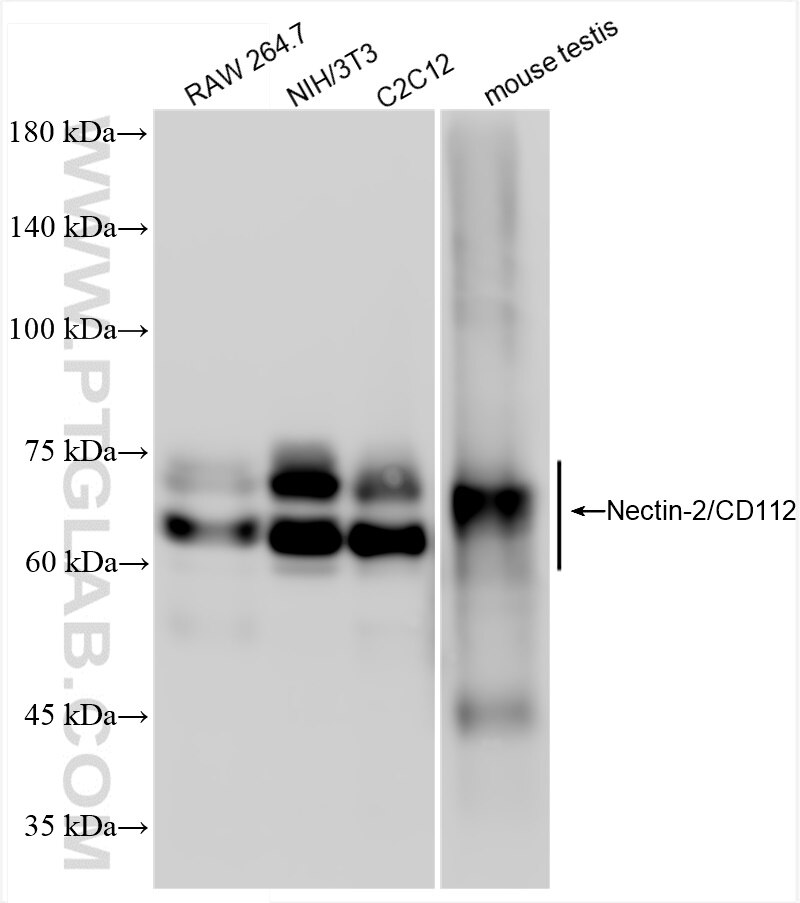 The Nectin-2/CD112 antibody from Proteintech is a rabbit recombinant antibody to a fusionprotein of mouse Nectin-2/CD112. This antibody recognizes mouse antigen. The Nectin-2/CD112 antibody has been validated for the following applications: WB, ELISA analysis.