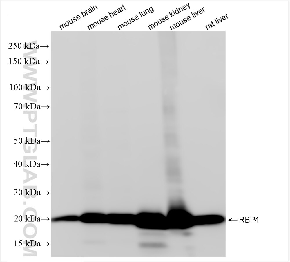 The RBP4 antibody from Proteintech is a rabbit recombinant antibody to a fusion protein of mouse RBP4. This antibody recognizes mouse, rat antigen. The RBP4 antibody has been validated for the following applications: WB, IHC, ELISA analysis.