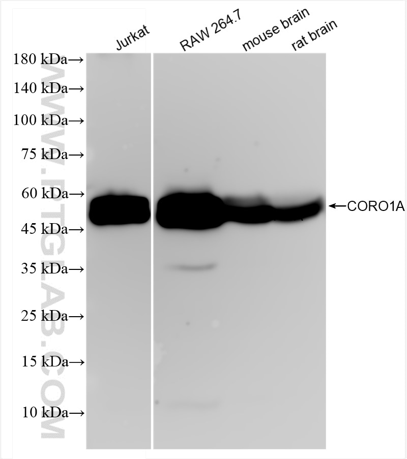 The CORO1A antibody from Proteintech is a rabbit recombinant antibody to a recombinant protein of human CORO1A. This antibody recognizes human, mouse, rat antigen. The CORO1A antibody has been validated for the following applications: WB, IF/ICC, FC (Intra), ELISA analysis.