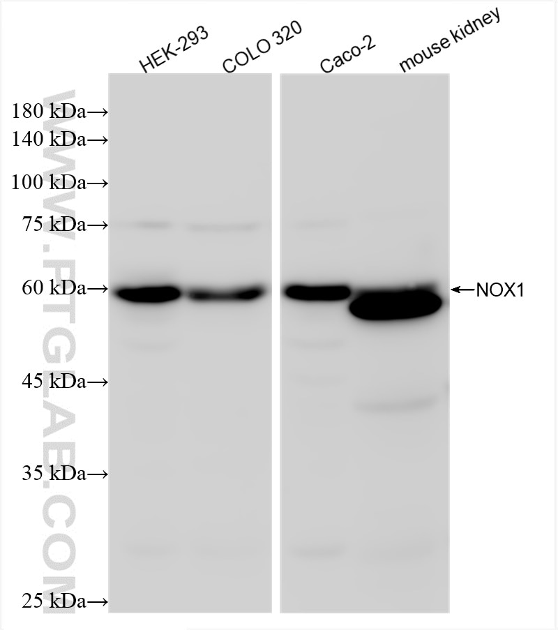 The NOX1 antibody from Proteintech is a rabbit recombinant antibody to a recombinant protein of human NOX1. This antibody recognizes human, mouse antigen. The NOX1 antibody has been validated for the following applications: WB, ELISA analysis.