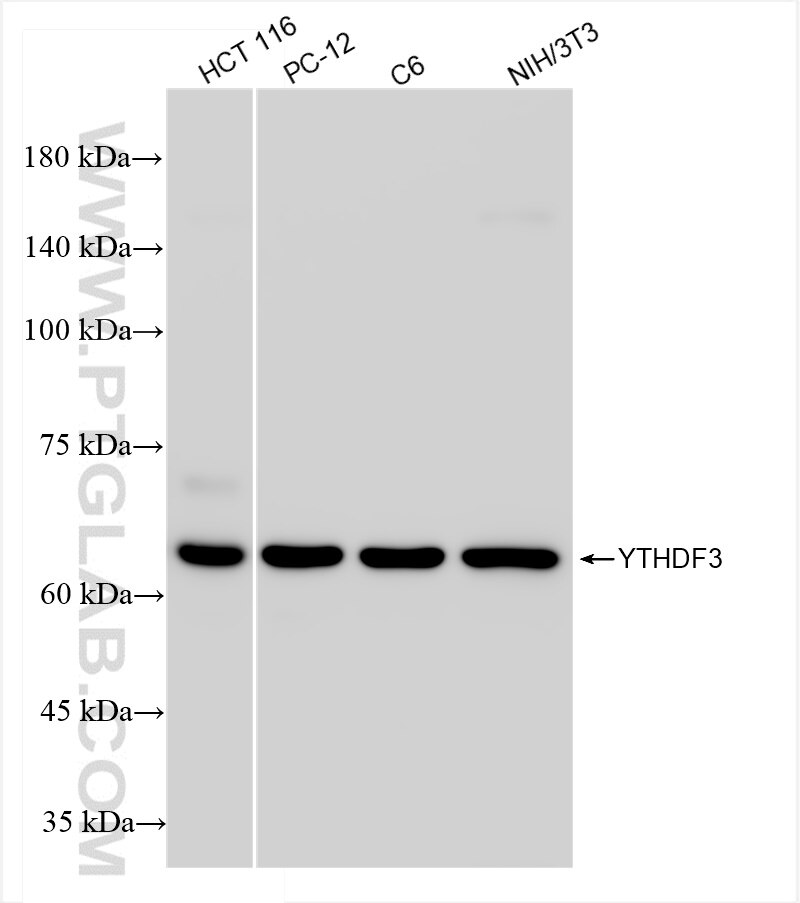 The YTHDF3 antibody from Proteintech is a rabbit recombinant antibody to a recombinant protein of human YTHDF3. This antibody recognizes human, mouse, rat antigen. The YTHDF3 antibody has been validated for the following applications: WB, ELISA analysis.