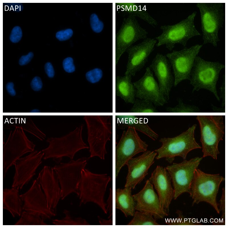The PSMD14/POH1 antibody from Proteintech is a rabbit recombinant antibody to a recombinant protein of human PSMD14/POH1. This antibody recognizes human antigen. The PSMD14/POH1 antibody has been validated for the following applications: IF/ICC, ELISA analysis.