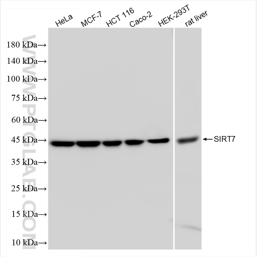 The SIRT7 antibody from Proteintech is a rabbit recombinant antibody to a recombinant protein of human SIRT7. This antibody recognizes human, rat antigen. The SIRT7 antibody has been validated for the following applications: WB, IHC, IP, ELISA analysis.