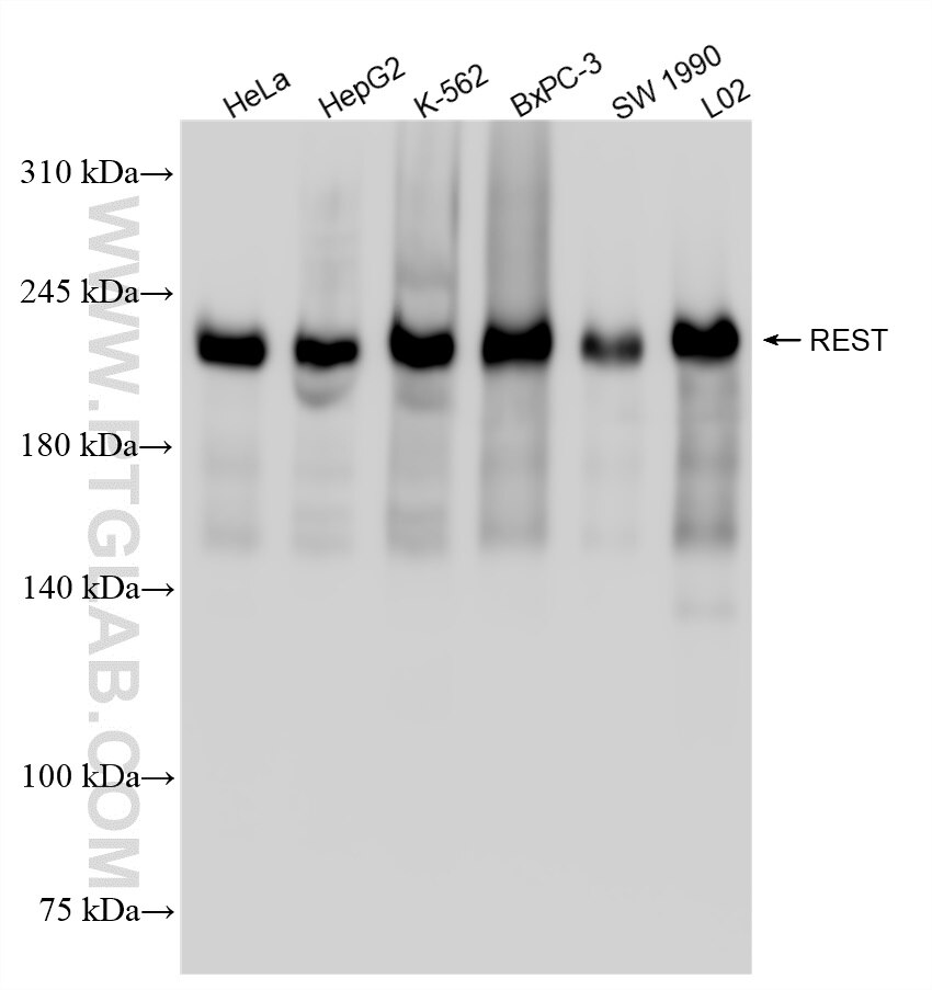 The REST antibody from Proteintech is a rabbit recombinant antibody to a recombinant protein of human REST. This antibody recognizes human antigen. The REST antibody has been validated for the following applications: WB, IF/ICC, ChIP, ELISA analysis.