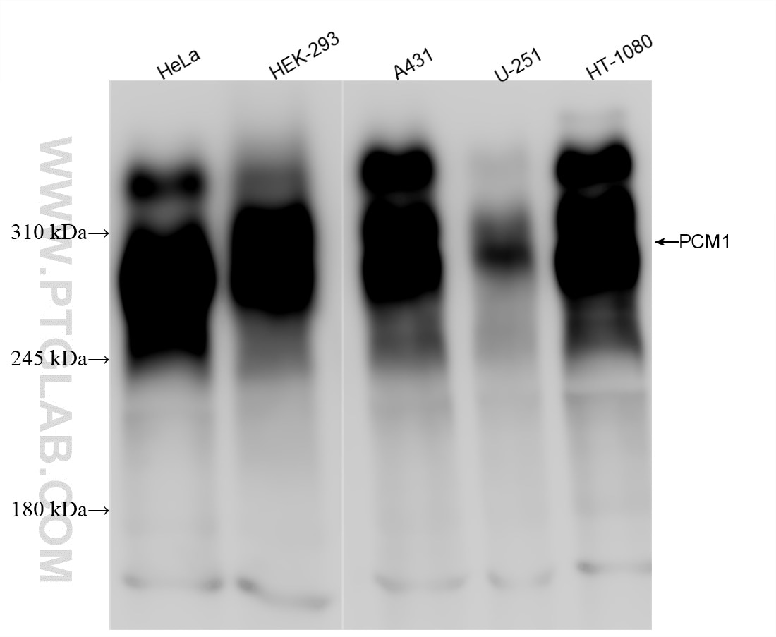 The PCM1 antibody from Proteintech is a rabbit recombinant antibody to a recombinant protein of human PCM1. This antibody recognizes human, mouse antigen. The PCM1 antibody has been validated for the following applications: WB, IHC, IF/ICC, FC (Intra), ELISA analysis.