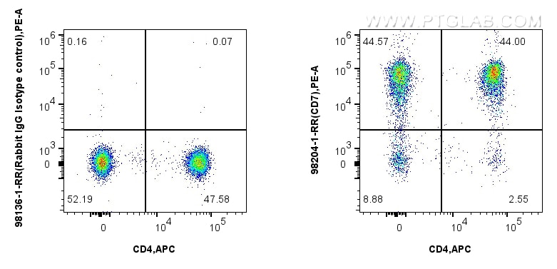 The CD7 antibody from Proteintech is a rabbit recombinant antibody to a recombinant protein of human CD7. This antibody recognizes human antigen. The CD7 antibody has been validated for the following applications: FC analysis.