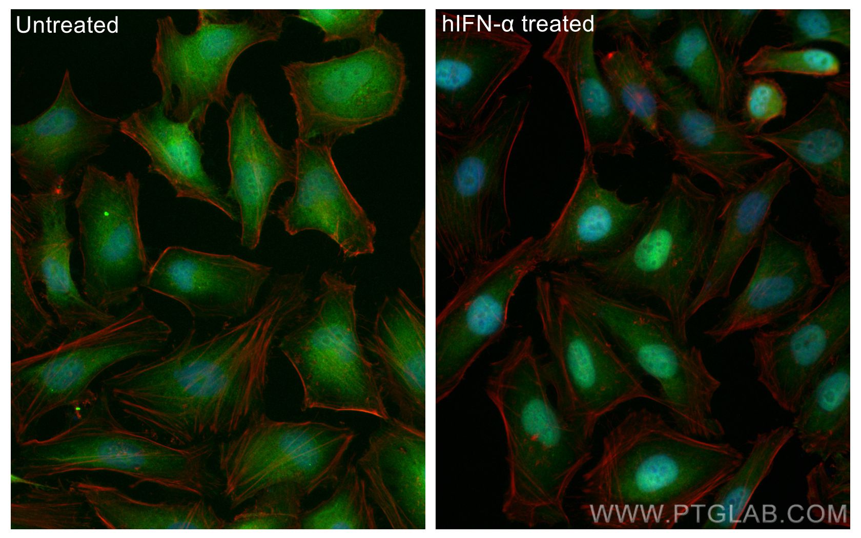 The STAT1 antibody from Proteintech is a rabbit recombinant antibody to a recombinant protein of human STAT1. This antibody recognizes human, mouse, rat antigen. The STAT1 antibody has been validated for the following applications: IF/ICC analysis. This antibody is coraliteR plus 488.