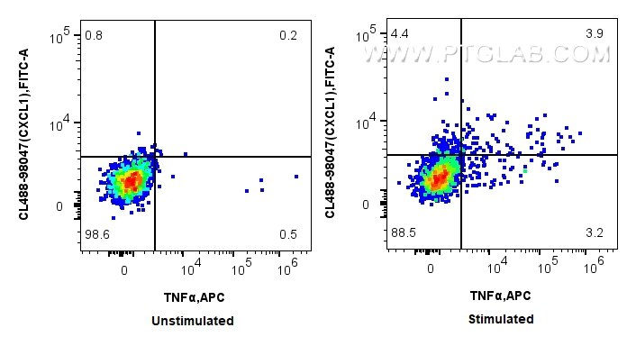 The CXCL1 antibody from Proteintech is a rabbit recombinant antibody to a fusion protein of mouse CXCL1. This antibody recognizes mouse antigen. The CXCL1 antibody has been validated for the following applications: FC (Intra) analysis. This antibody is coraliteR plus 488.