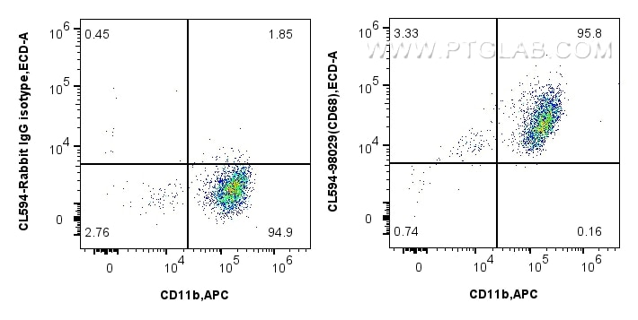 The CD68 antibody from Proteintech is a rabbit recombinant antibody to a fusion protein of mouse CD68. This antibody recognizes mouse antigen. The CD68 antibody has been validated for the following applications: FC (Intra) analysis. This antibody is coraliteR594.