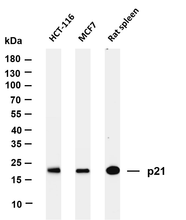 Various whole cell lysates were separated by 4-20% SDS-PAGE, and the membrane was blotted with anti-p21 (PT0237R) antibody. The HRP-conjugated Goat anti-Rabbit IgG(H + L) antibody was used to detect the antibody.Lane 1: HCT-116Lane 2: MCF7Lane 3: Rat spleenPredicted band size: 18kDaObserved band size: 18kDa