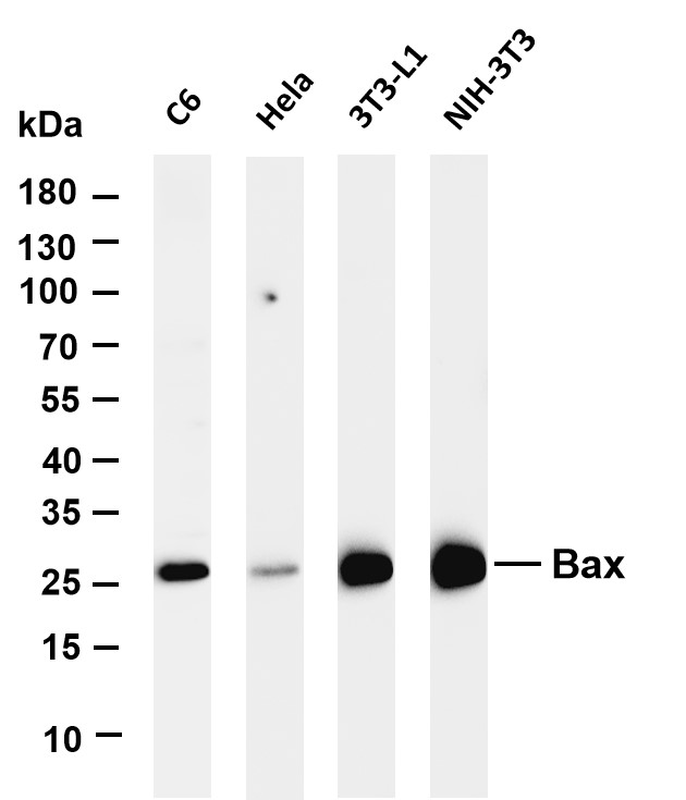 Various whole cell lysates were separated by 4-20% SDS-PAGE, and the membrane was blotted with anti-Bax (PT0301R) antibody. The HRP-conjugated Goat anti-Rabbit IgG(H + L) antibody was used to detect the antibody.Lane 1: C6Lane 2: HelaLane 3: 3T3-L1Lane 4: NIH-3T3Predicted band size: 21kDaObserved band size: 21kDa