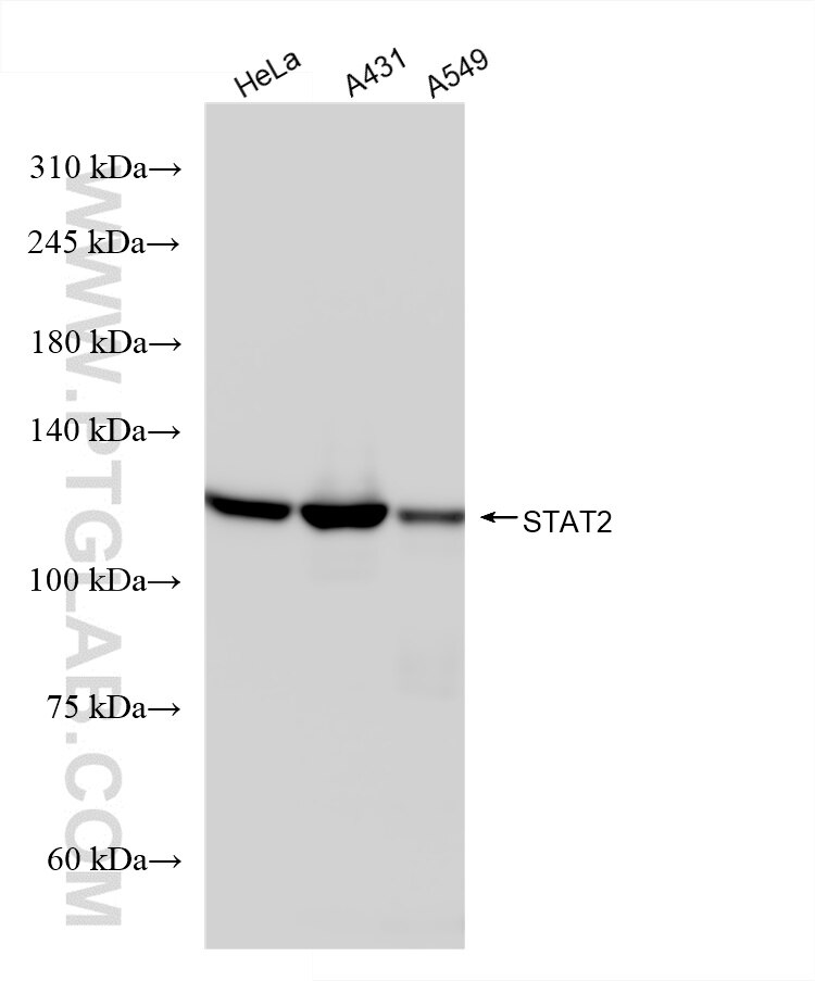 The STAT2 antibody from Proteintech is a rabbit recombinant antibody to a recombinant protein of human STAT2. This antibody recognizes human antigen. The STAT2 antibody has been validated for the following applications: WB, ELISA analysis.