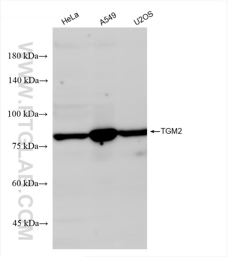 The TGM2 antibody from Proteintech is a rabbit recombinant antibody to a recombinant protein of human TGM2. This antibody recognizes human antigen. The TGM2 antibody has been validated for the following applications: WB, IHC, ELISA analysis.