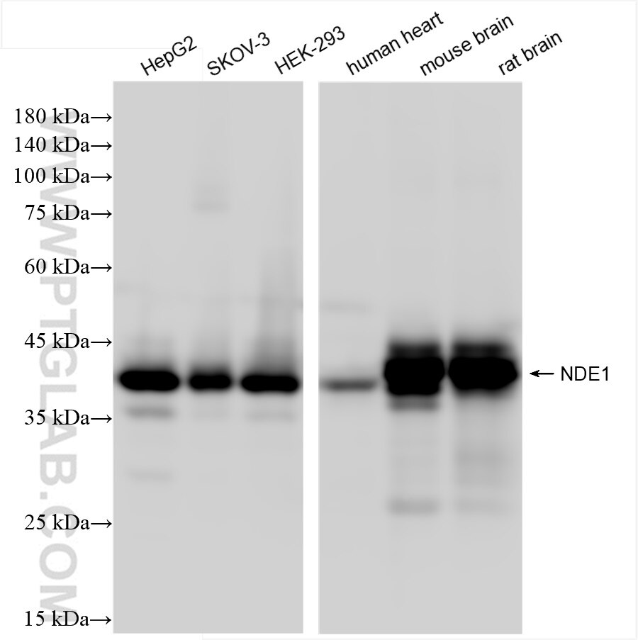 The NDE1 antibody from Proteintech is a rabbit recombinant antibody to a recombinant protein of human NDE1. This antibody recognizes human, mouse, rat antigen. The NDE1 antibody has been validated for the following applications: WB, IHC, IF/ICC, ELISA analysis.
