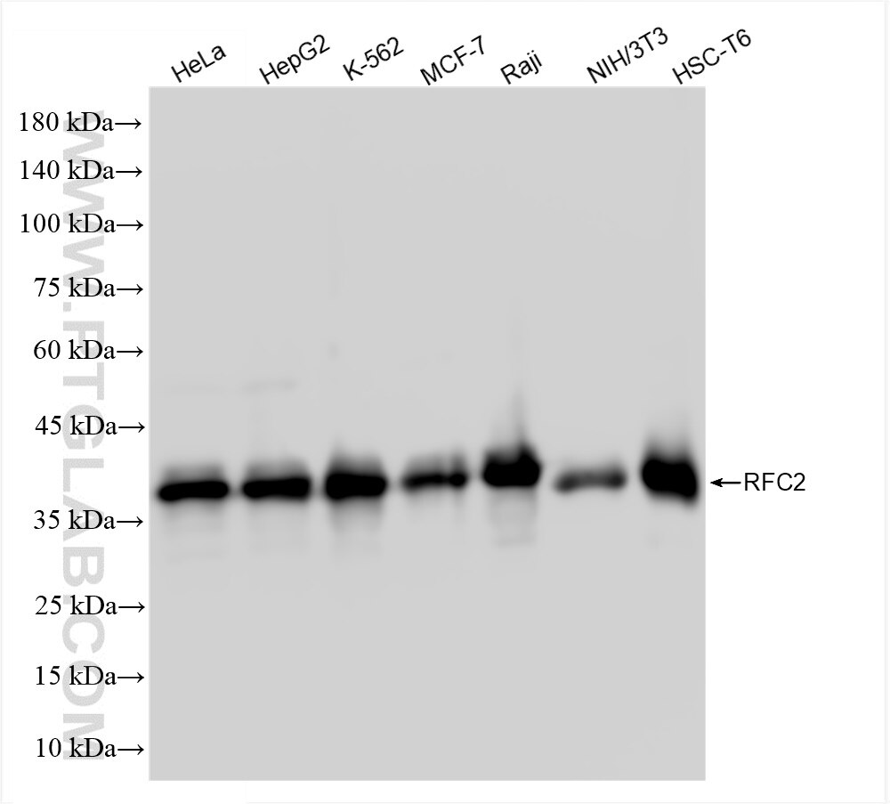 The RFC2 antibody from Proteintech is a rabbit recombinant antibody to a recombinant protein of human RFC2. This antibody recognizes human, mouse, rat antigen. The RFC2 antibody has been validated for the following applications: WB, IHC, IF/ICC, FC (Intra), ELISA analysis.