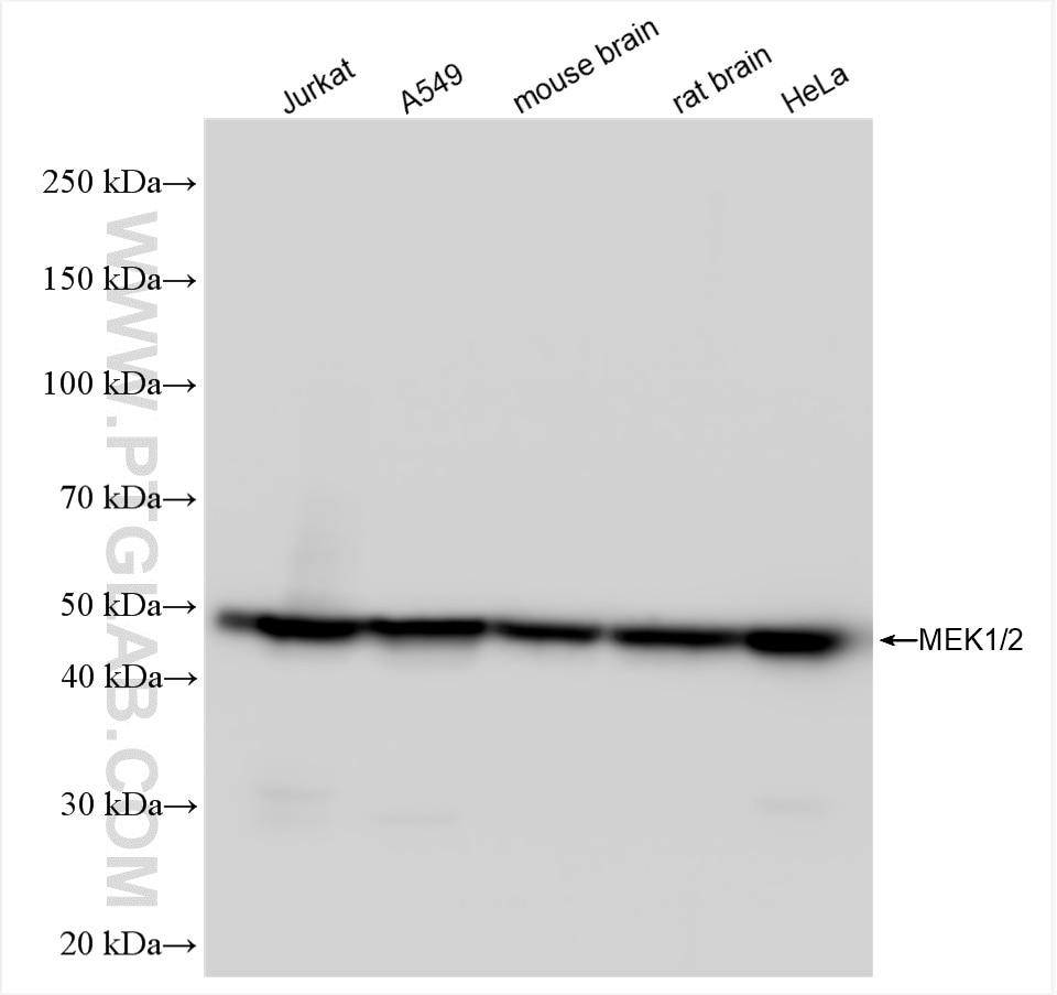 The MEK1/2 antibody from Proteintech is a rabbit recombinant antibody to a recombinant protein of human MEK1/2. This antibody recognizes human, mouse, rat antigen. The MEK1/2 antibody has been validated for the following applications: WB, IF/ICC, FC (Intra), ELISA analysis.
