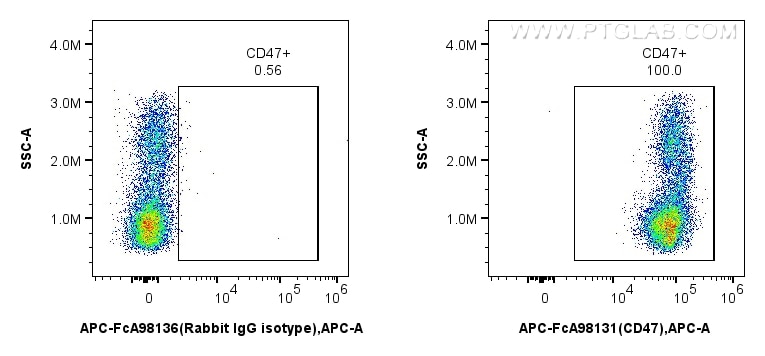 The CD47 antibody from Proteintech is a rabbit recombinant antibody to a recombinant protein of human CD47. This antibody recognizes human antigen. The CD47 antibody has been validated for the following applications: FC analysis. This antibody is apc.