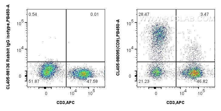 The CD9 antibody from Proteintech is a rabbit recombinant antibody to a recombinant protein of human CD9. This antibody recognizes human antigen. The CD9 antibody has been validated for the following applications: FC analysis. This antibody is coraliteR plus 405.